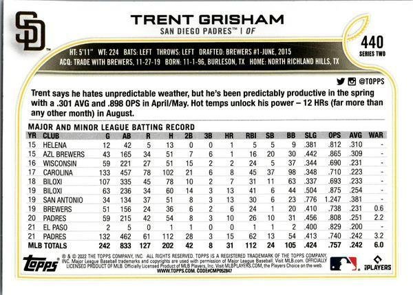 This is a nice example of a 2022 Topps #440 Trent Grisham