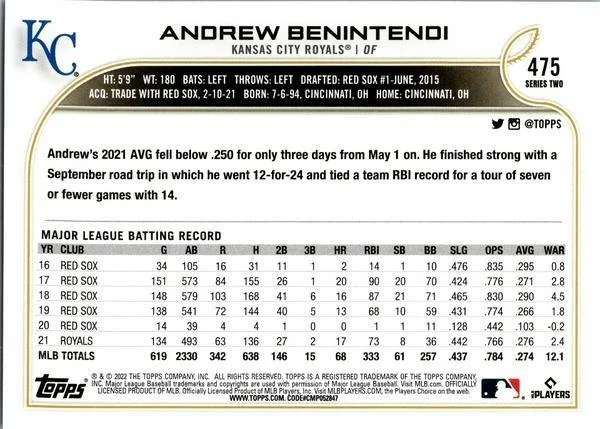 This is a nice example of a 2022 Topps #475 Andrew Benintendi