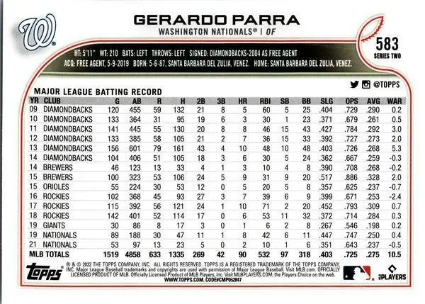 This is a nice example of a 2022 Topps #583 Gerardo Parra