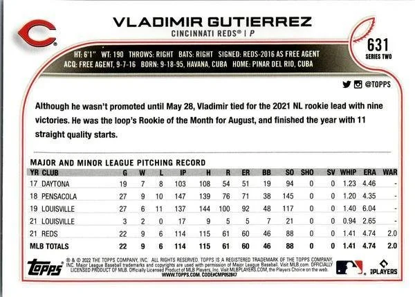 This is a nice example of a 2022 Topps #631 Vladimir Gutierrez