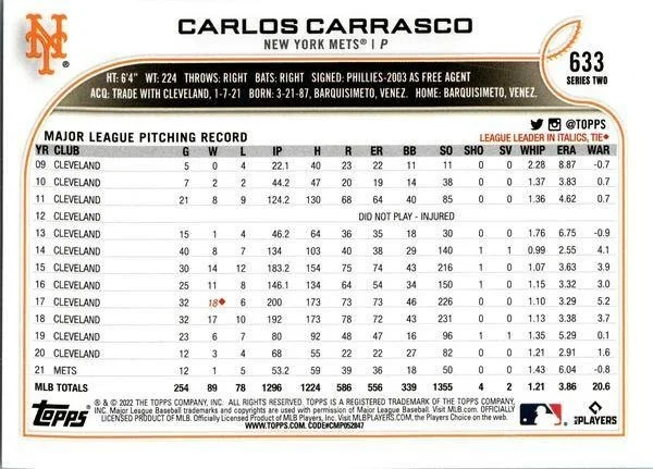 This is a nice example of a 2022 Topps #633 Carlos Carrasco