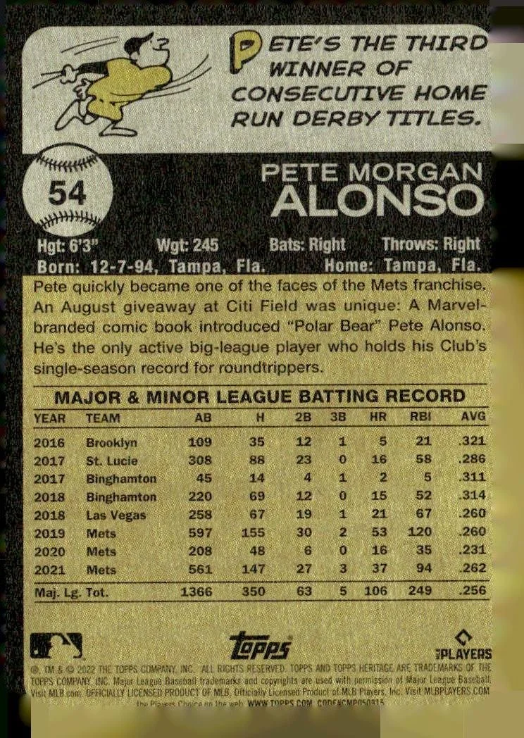 This is a nice example of a 2022 Topps Heritage #54 Pete Alonso