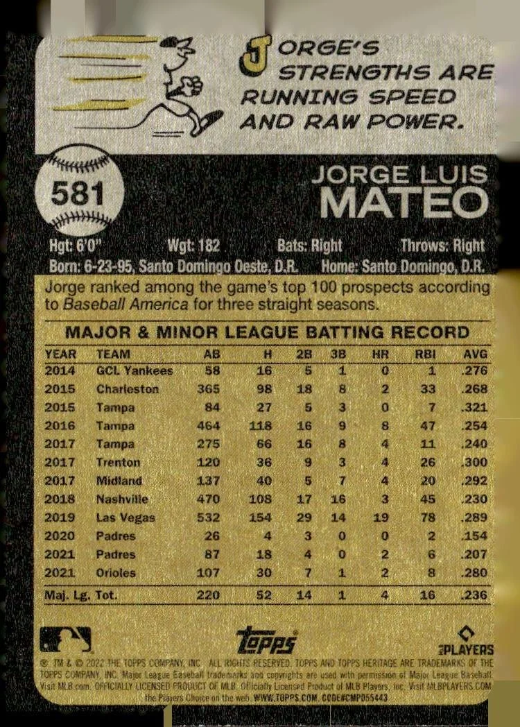 This is a nice example of a 2022 Topps Heritage #581 Jorge Mateo