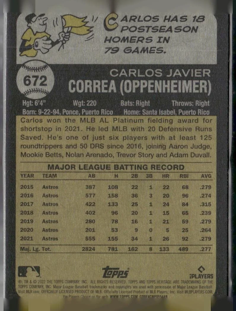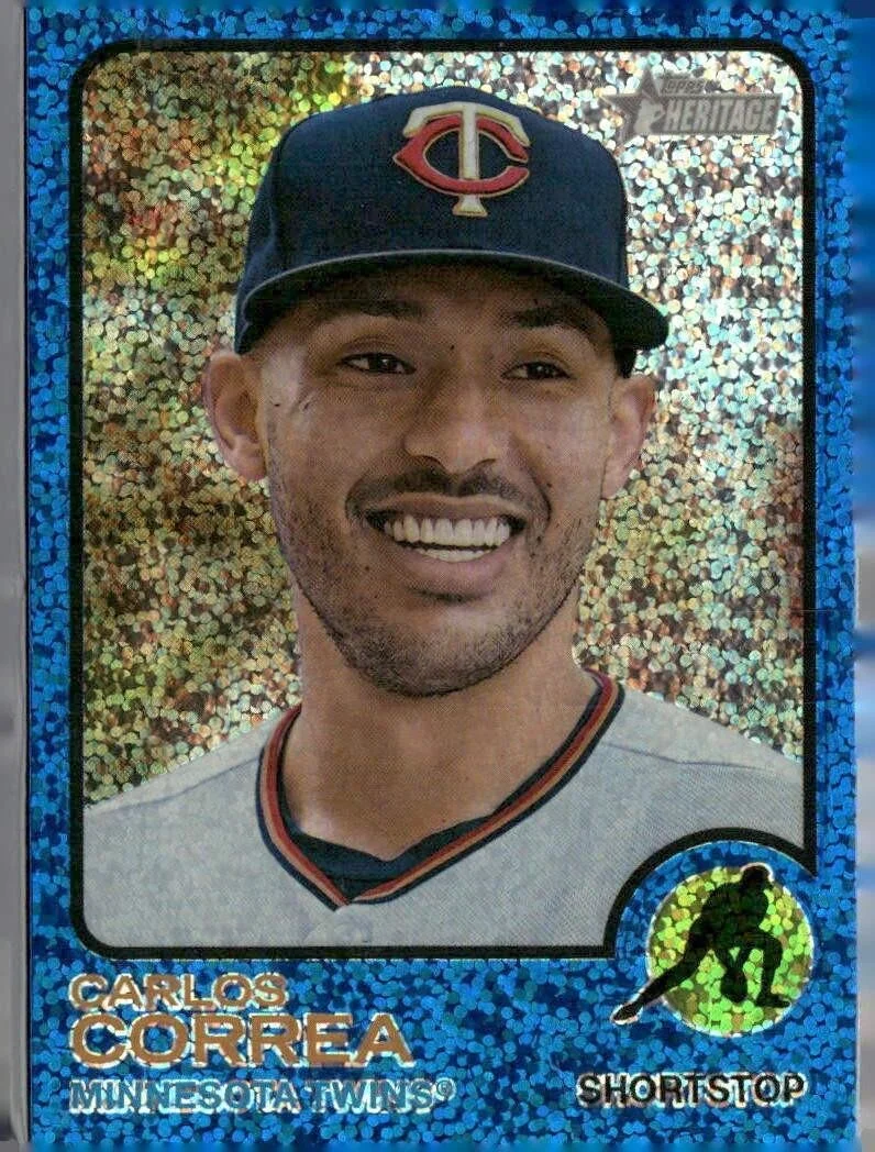 This is a nice example of a 2022 Topps Heritage #672 Carlos Correa Chrome Blue Sparkle