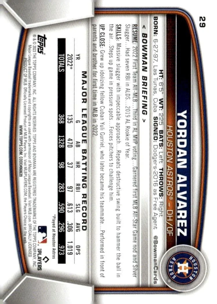 This is a nice example of a 2023 Bowman #29 Yordan Alvarez