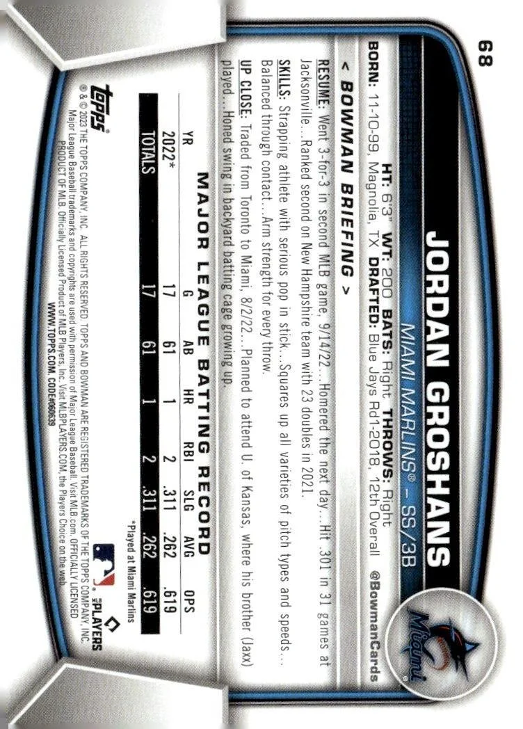 This is a nice example of a 2023 Bowman #68 Jordan Groshans