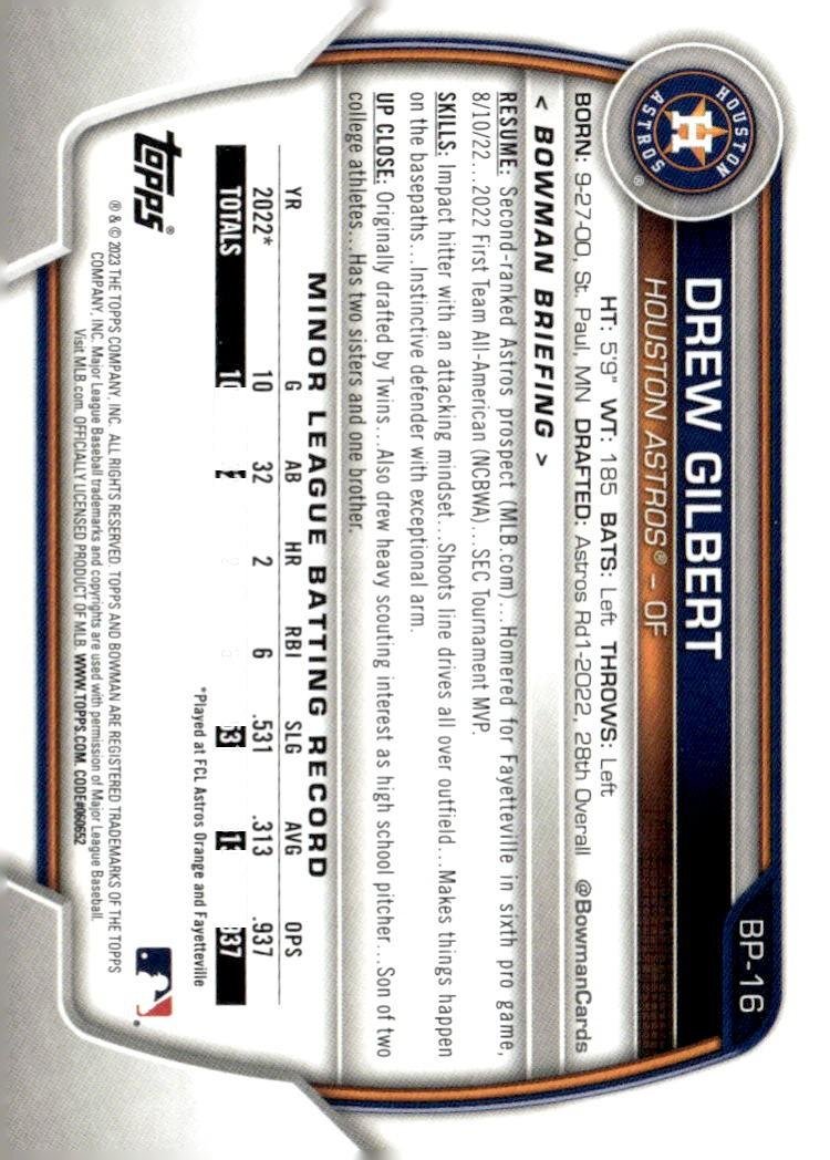 This is a nice example of a 2023 Bowman #BP-16 Drew Gilbert Prospects