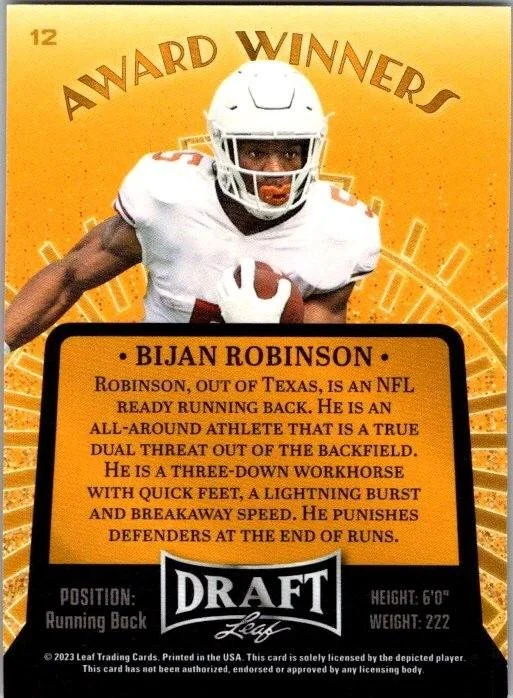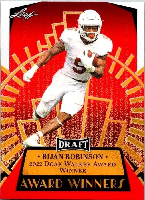 This is a nice example of a 2023 Leaf Draft #12 Bijan Robinson Red