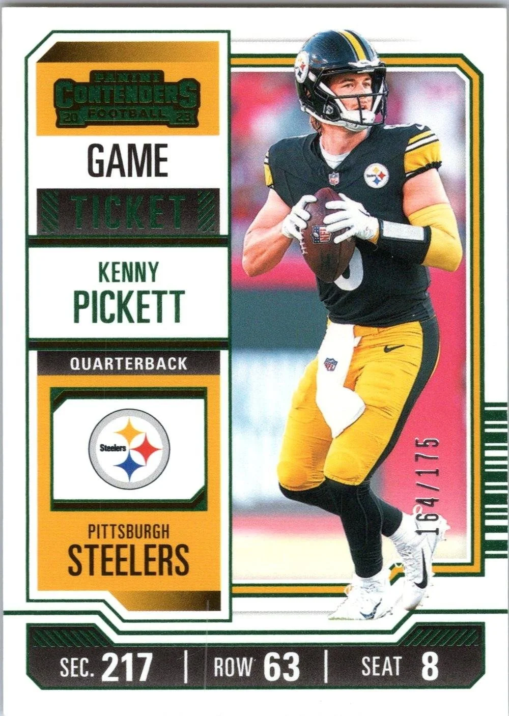 This is a nice example of a 2023 Panini Contenders #83 Kenny Pickett Game Ticket Green