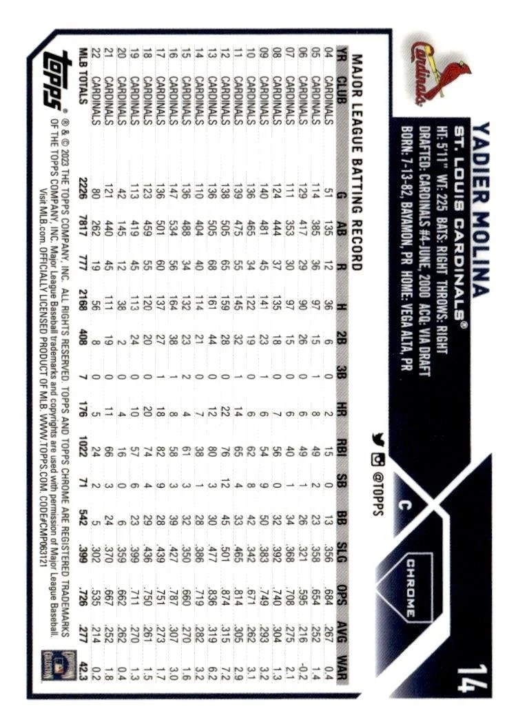 This is a nice example of a 2023 Topps Chrome #14 Yadier Molina