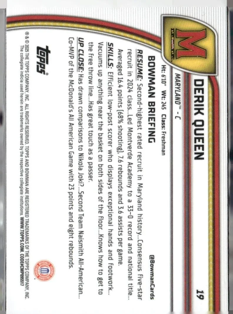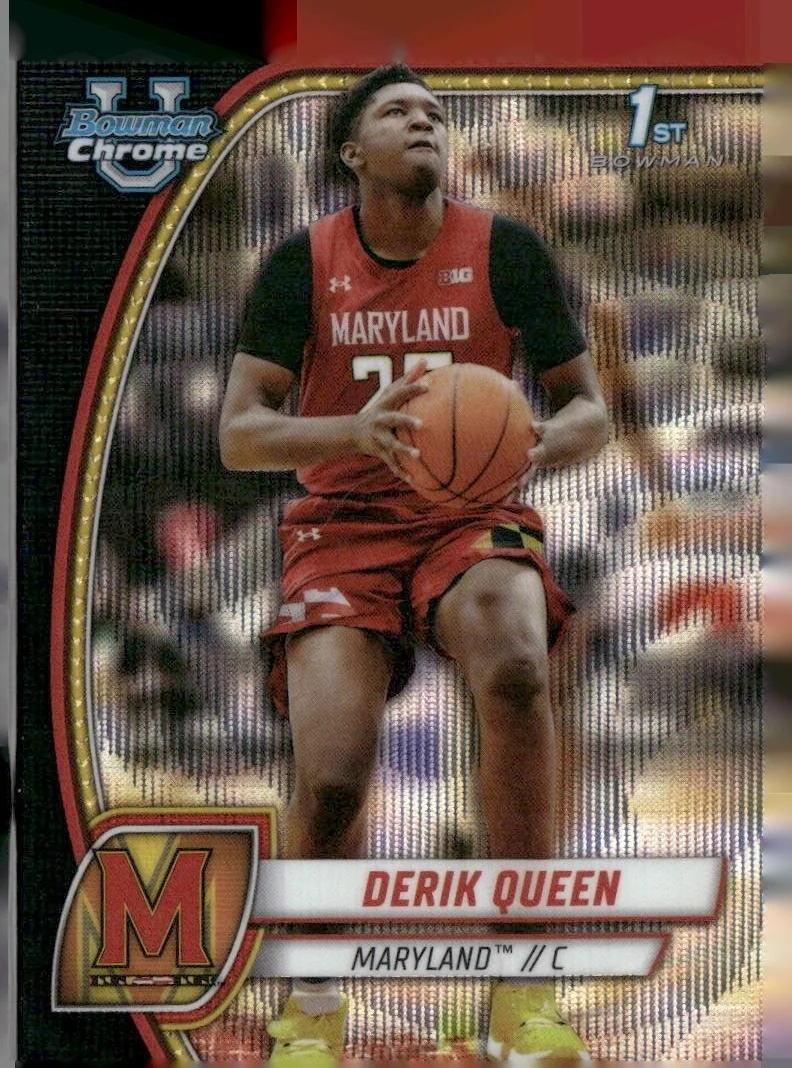 This is a nice example of a 2024-25 Bowman University Chrome #19 Derik Queen Black Wave Refractor