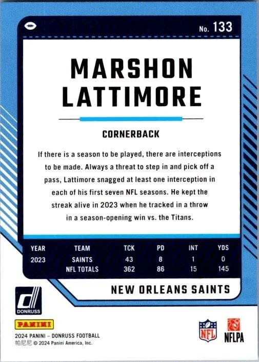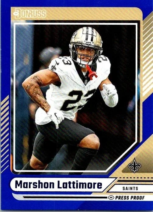This is a nice example of a 2024 Donruss #133 Marshon Lattimore Press Proof Blue