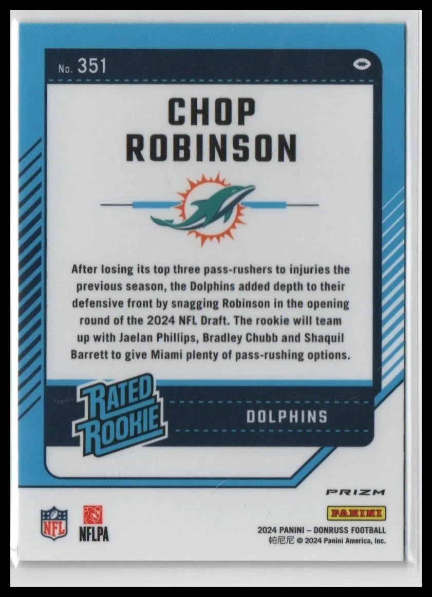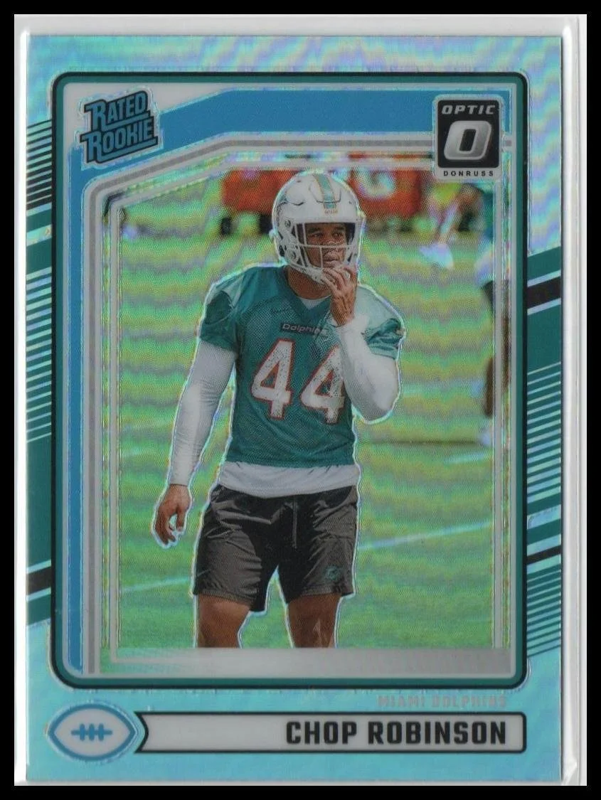 This is a nice example of a 2024 Donruss #351 Chop Robinson Optic Rated Rookies Preview Holo
