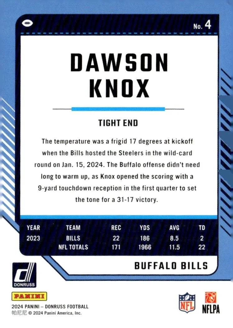 This is a nice example of a 2024 Donruss #4 Dawson Knox