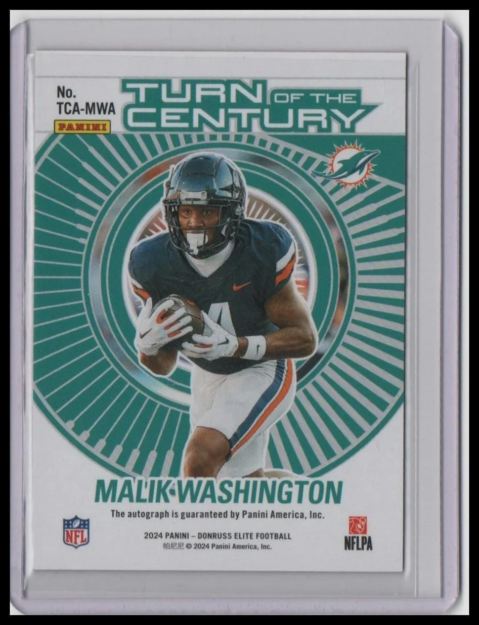 Up for sale is a 2024 Donruss Elite Turn of the Century Autographs Red #TCA-MWA Malik Washington rookie card, serial numbered #/49 and featuring a bold on-card autograph. This is a premium early-season release for one of Miami’s most intriguing rookie wideouts.