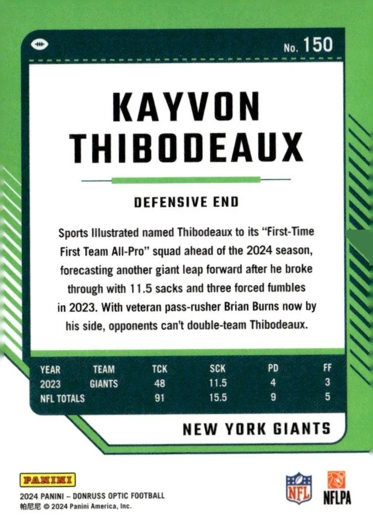 This is a nice example of a 2024 Donruss Optic #150 Kayvon Thibodeaux