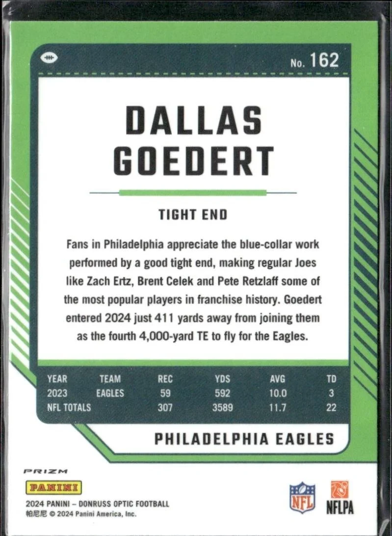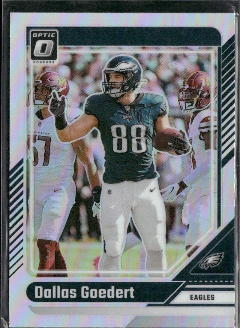 This is a nice example of a 2024 Donruss Optic #162 Dallas Goedert Holo