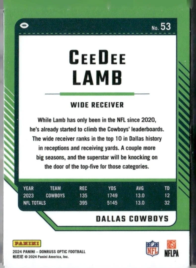 This is a nice example of a 2024 Donruss Optic #53 CeeDee Lamb