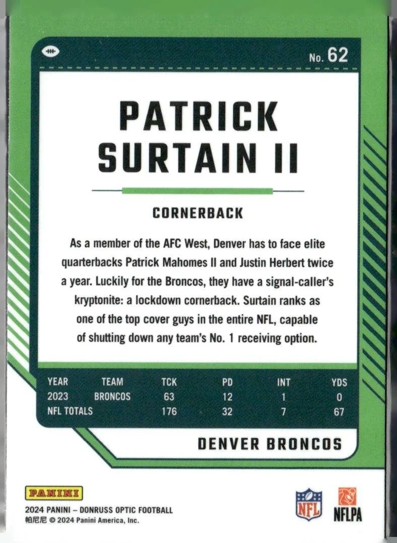 This is a nice example of a 2024 Donruss Optic #62 Patrick Surtain II