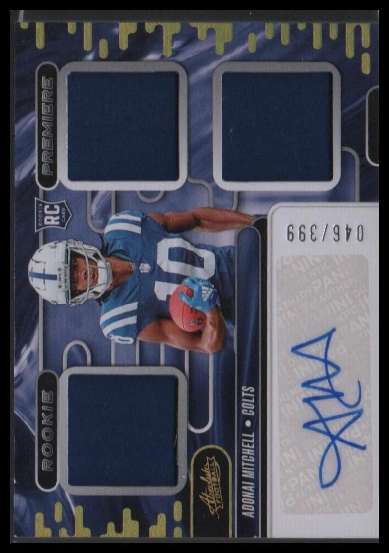 The 2024 Panini Absolute Rookie Premiere Materials Autographs Adonai Mitchell /399 is a standard-sized football trading card featuring an autograph from Adonai Mitchell of the Indianapolis Colts. This original card is part of the Rookie Premiere Materials Autographs set and has a limited print run of 399 copies. Autographed with a label or sticker, this card is authenticated by Panini Authentic and includes memorabilia from the player, making it a valuable collectible for fans and collectors alike.