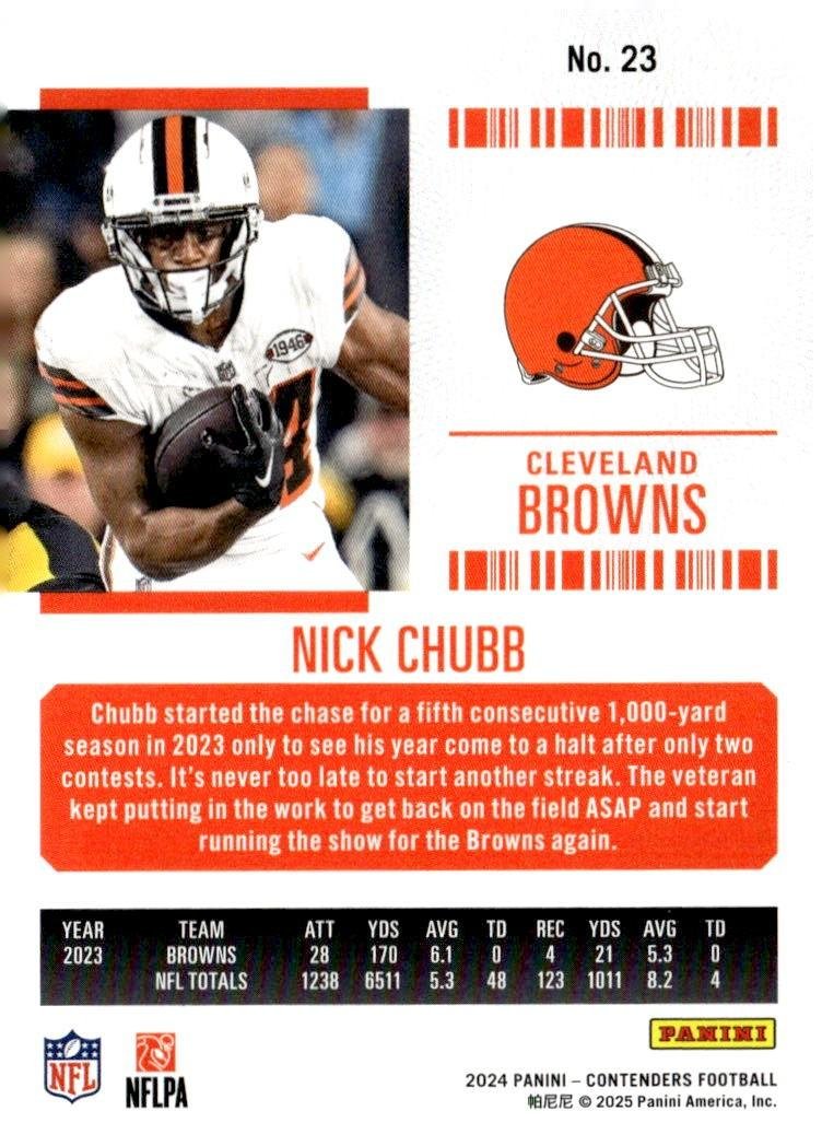 This is a nice example of a 2024 Panini Contenders #23 Nick Chubb Retail