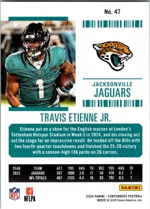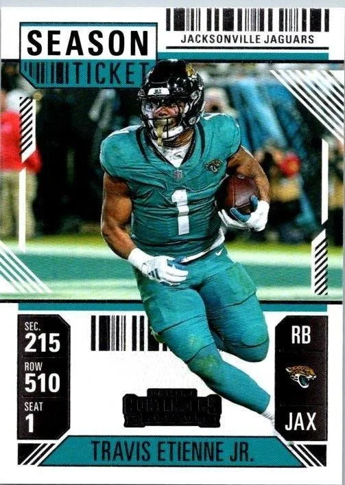 This is a nice example of a 2024 Panini Contenders #47 Travis Etienne Jr. Retail