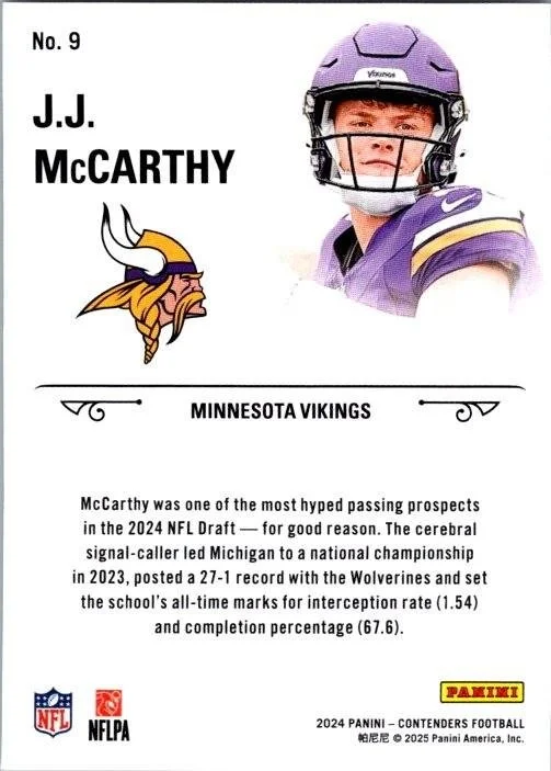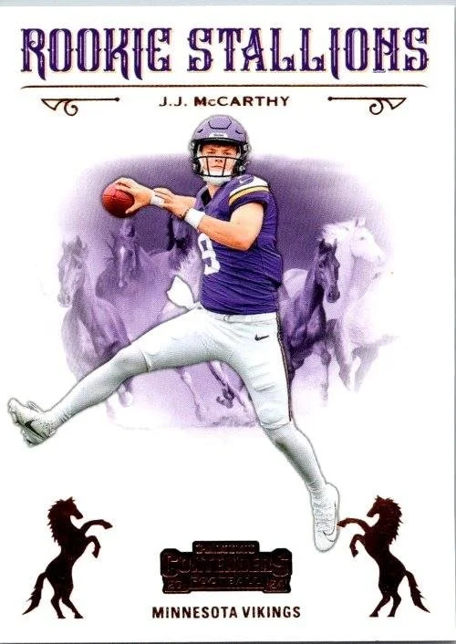 This is a nice example of a 2024 Panini Contenders #9 J.J. McCarthy Rookie Stallions Red