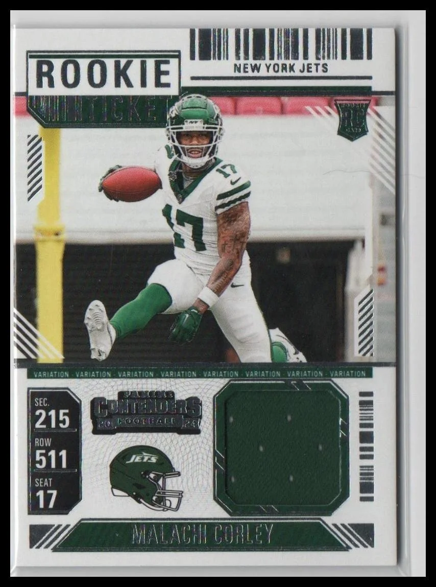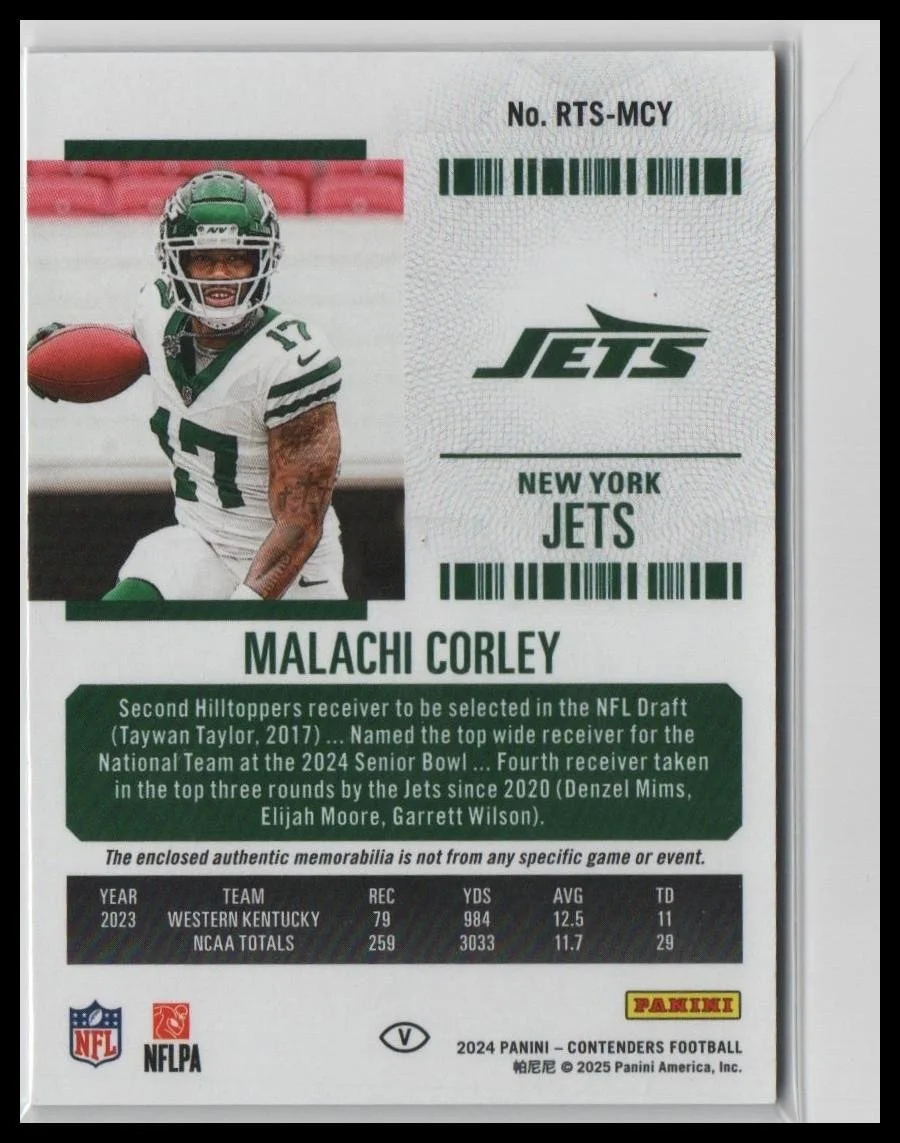This is a nice example of a 2024 Panini Contenders #RTS-MCY Malachi Corley Rookie Ticket Swatches