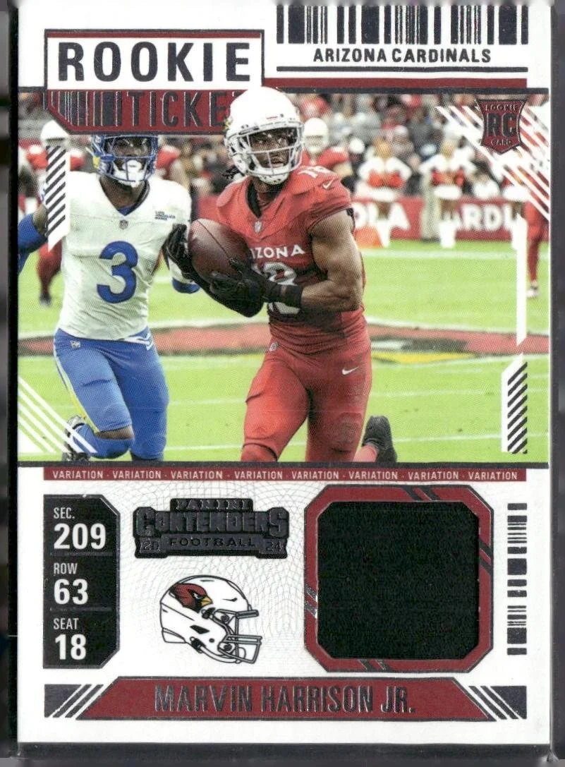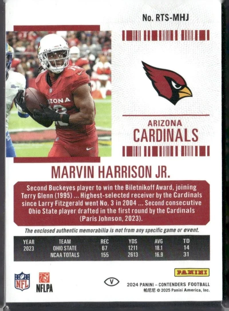 This is a nice example of a 2024 Panini Contenders #RTS-MHJ Marvin Harrison Jr. Rookie Ticket Swatches