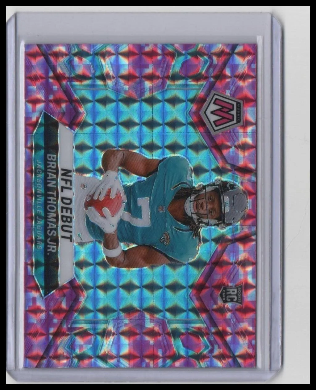 Up for grabs is a stunning Brian Thomas Jr. Rookie Card from the 2024 Panini Mosaic NFL Debut series. This is the Camo Pink Mosaic Prizm parallel, featuring vibrant colors and a sleek prizm finish that pops in any collection!Condition: Pack fresh and in excellent condition. Stored securely in a penny sleeve and top loader. Please review photos for details.