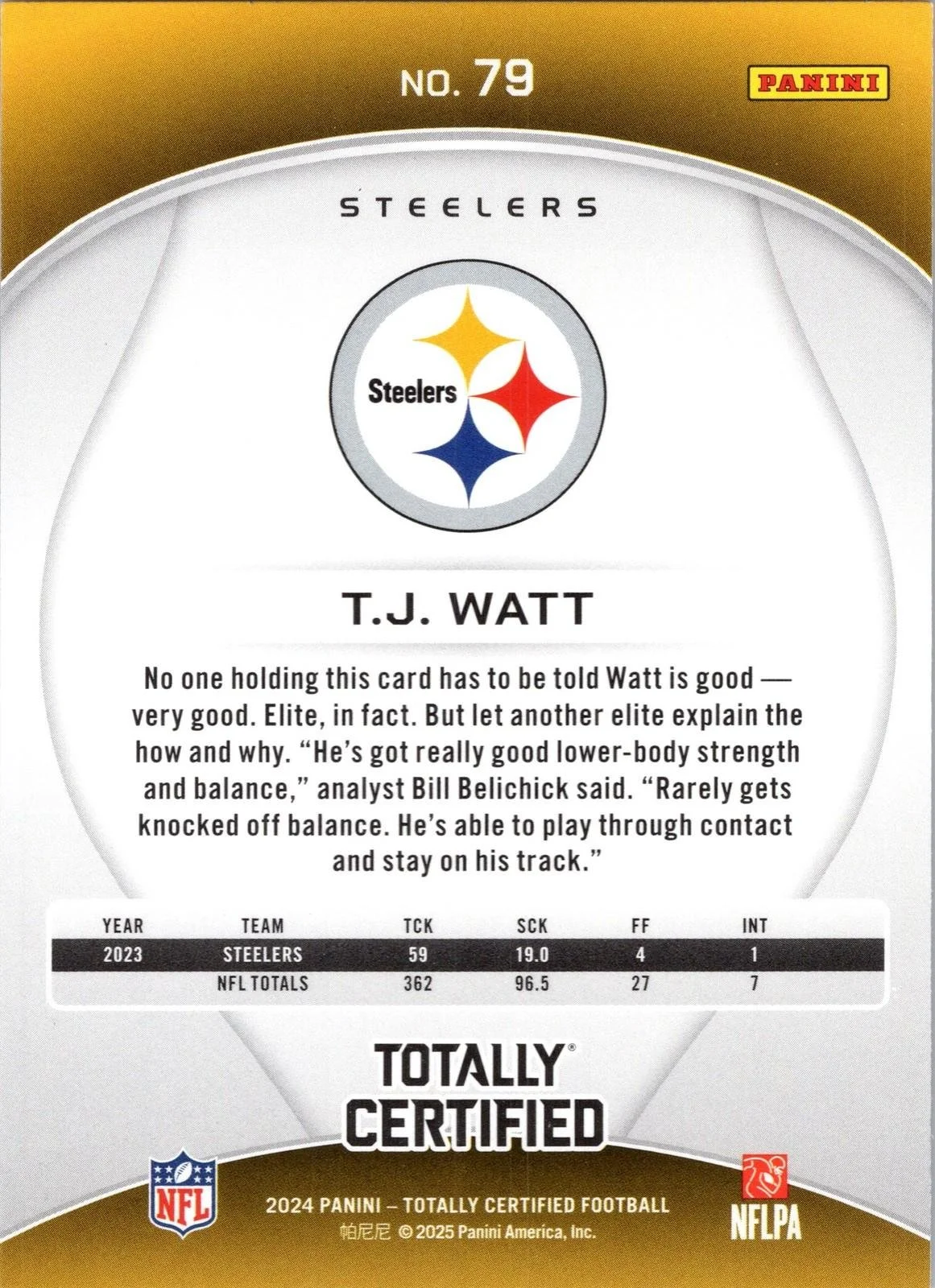 This is a nice example of a 2024 Panini Totally Certified #79 T.J. Watt