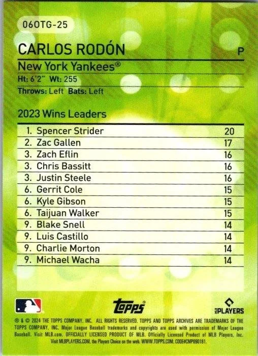 This is a nice example of a 2024 Topps Archives #06OTG-25 Carlos Rodón 2006 Topps Baseball Own the Game