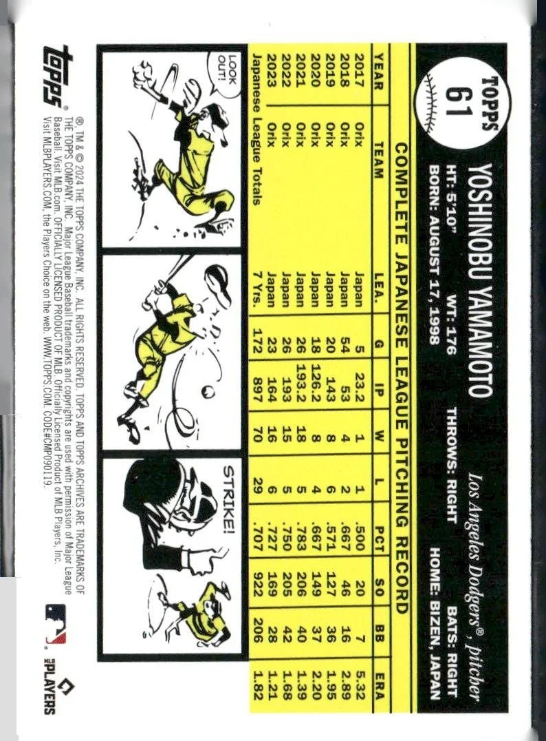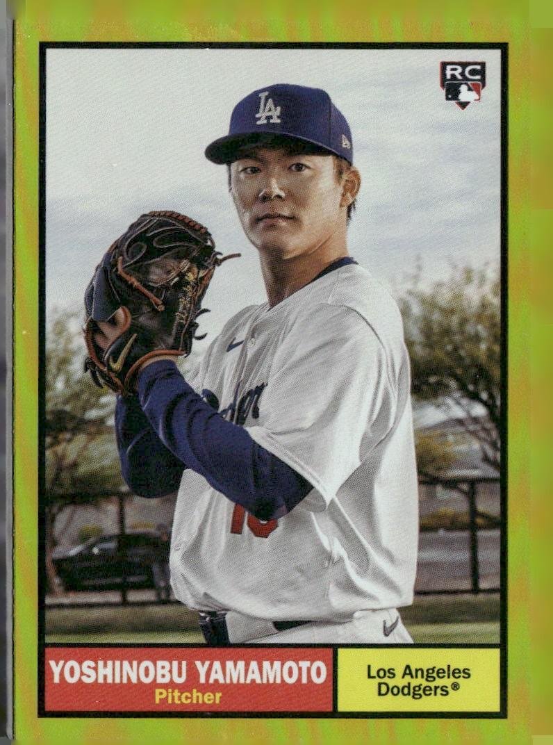 This is a nice example of a 2024 Topps Archives #61 Yoshinobu Yamamoto Yellow Foilboard