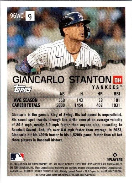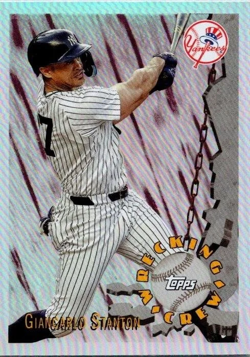 This is a nice example of a 2024 Topps Archives #96WC-9 Giancarlo Stanton 1996 Topps Baseball Wrecking Crew