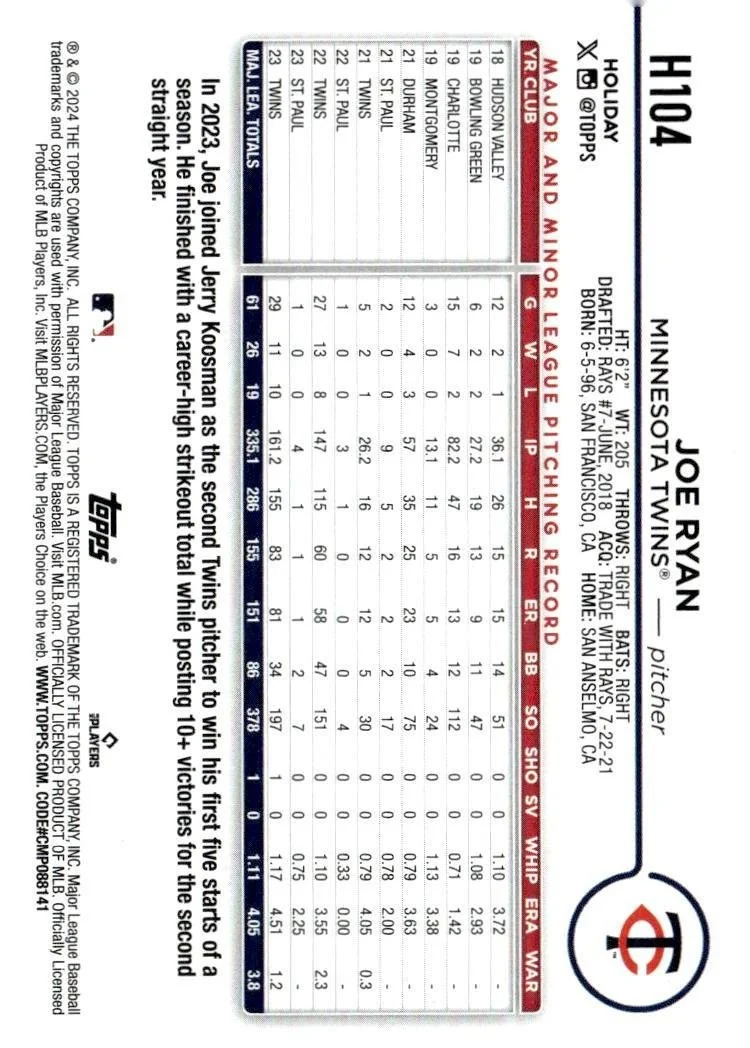 This is a nice example of a 2024 Topps Holiday #H104 Joe Ryan