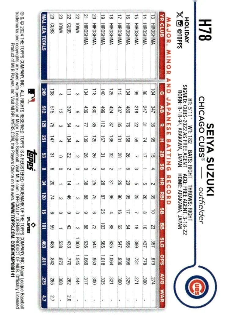 This is a nice example of a 2024 Topps Holiday #H78 Seiya Suzuki