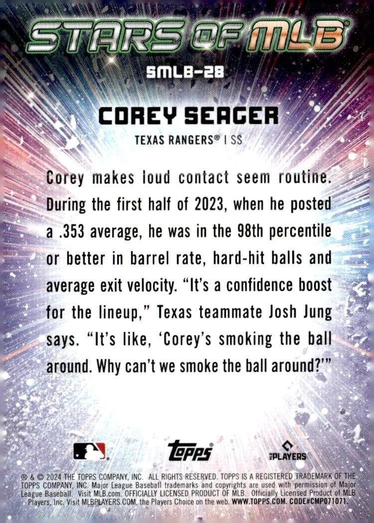 This is a nice example of a 2024 Topps #SMLB-28 Corey Seager Stars of MLB