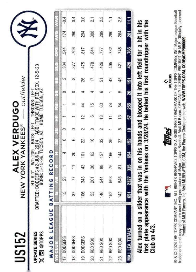 This is a nice example of a 2024 Topps Update #US152 Alex Verdugo