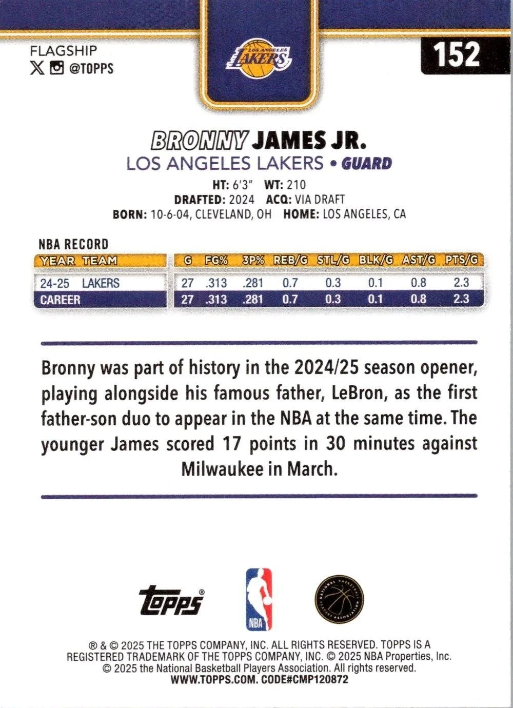 This is a nice example of a 2025-26 Topps #152 Bronny James Jr.