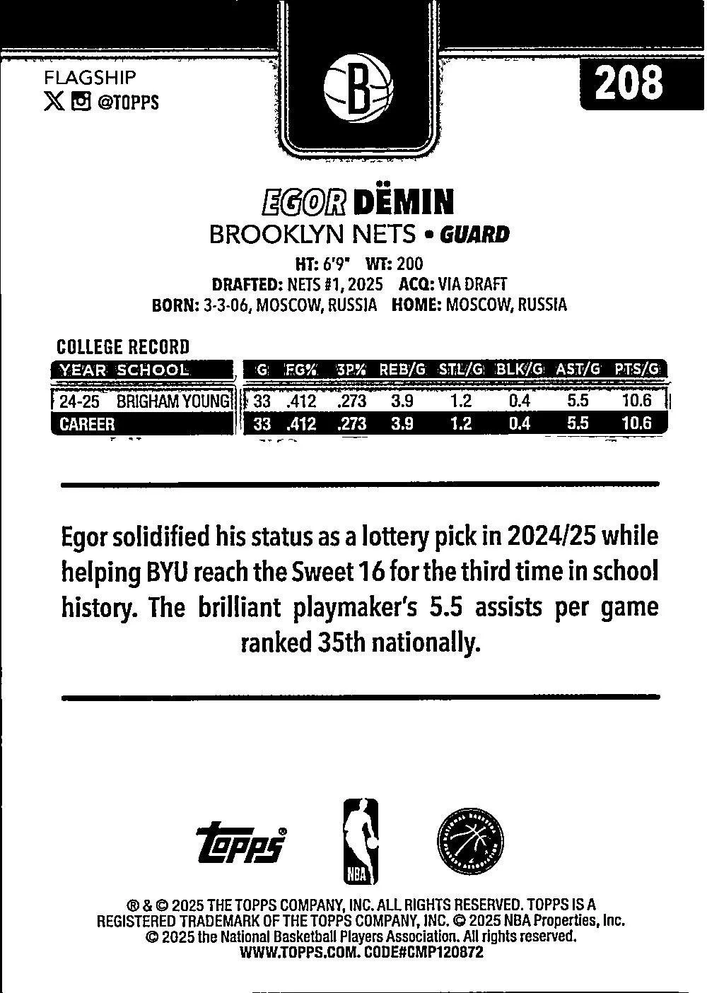 This is a nice example of a 2025-26 Topps #208 Egor Dëmin