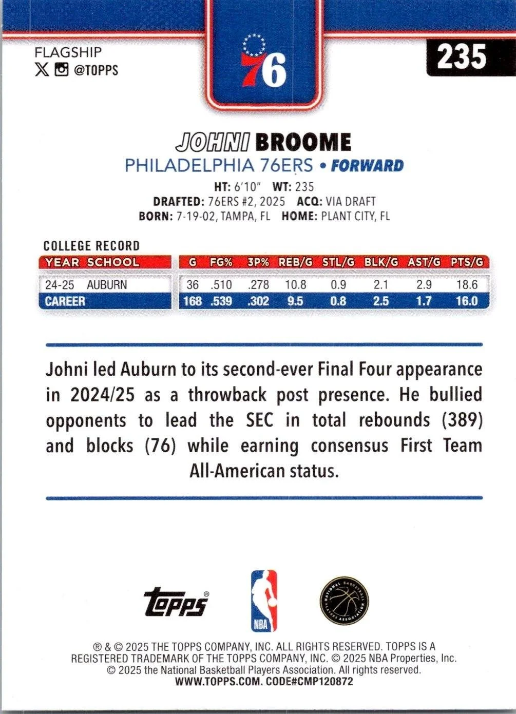 In 2025 Johni Broome played for the Philadelphia 76ers.