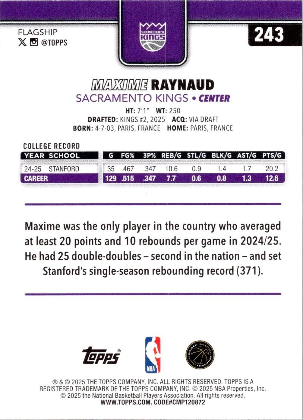 This is a nice example of a 2025-26 Topps #243 Maxime Raynaud