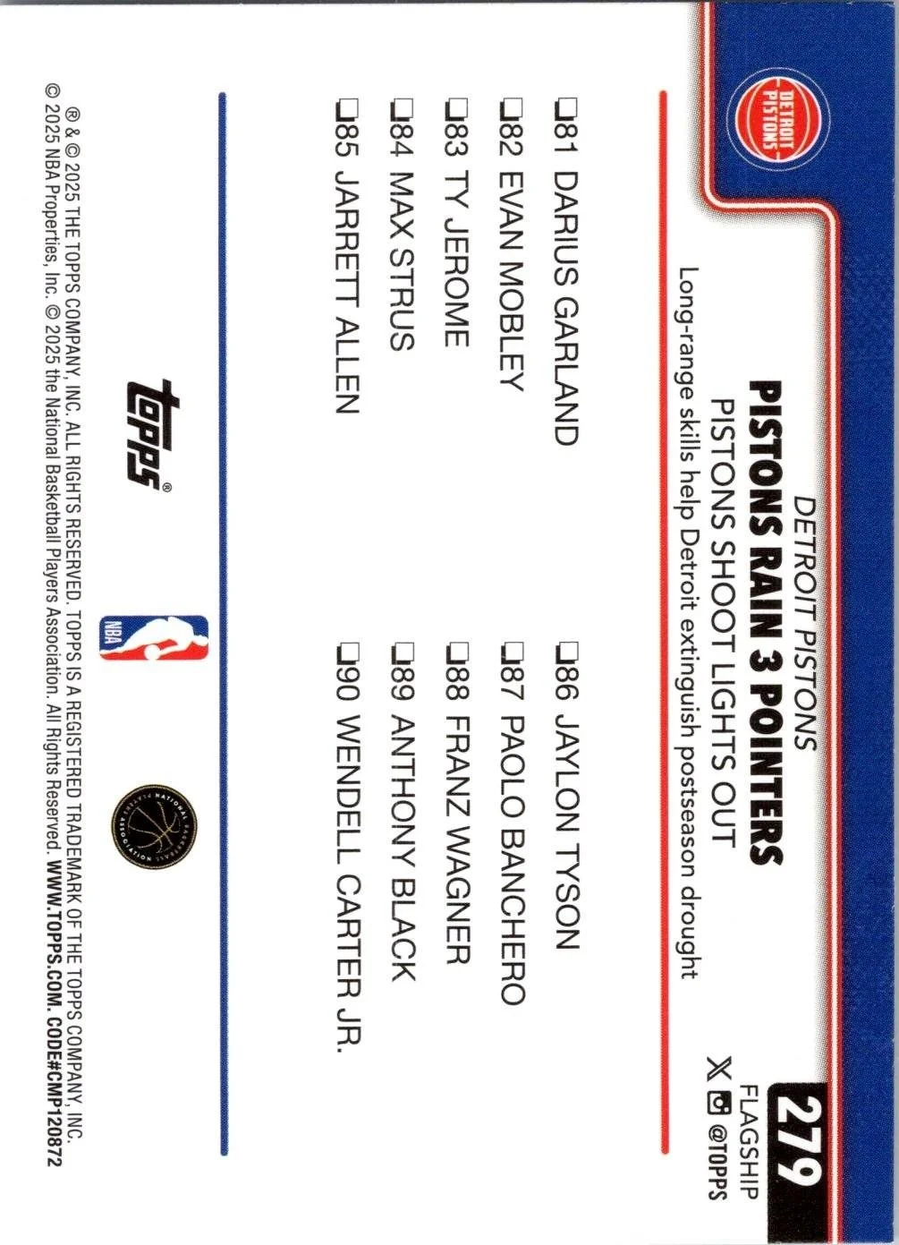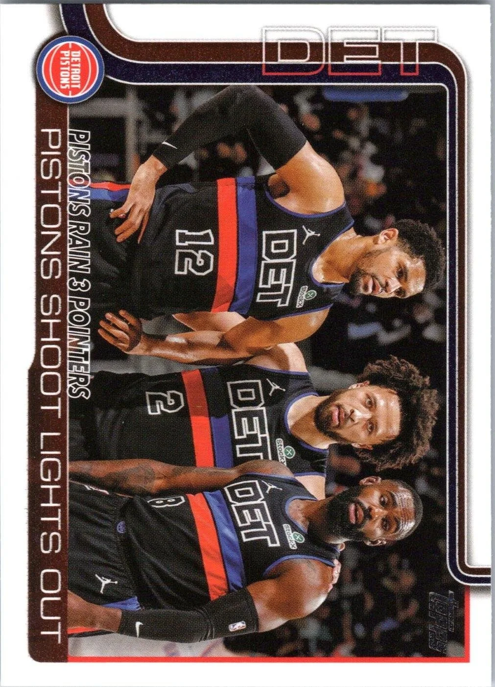 This is a nice example of a 2025-26 Topps #279 Pistons Rain 3 Pointers: Pistons Shoot Lights Out