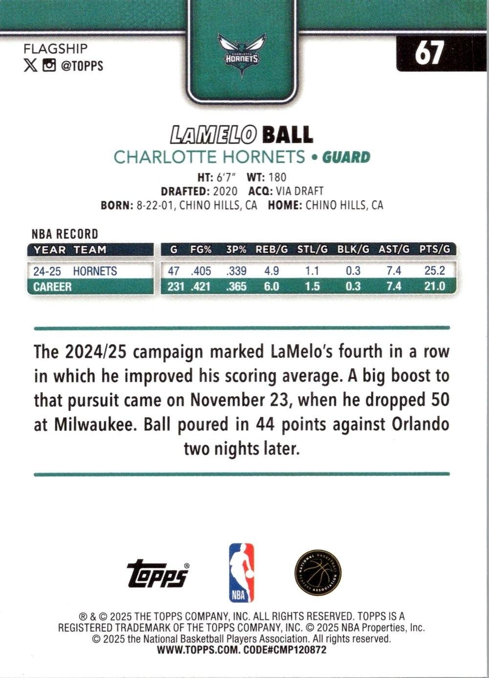 This is a nice example of a 2025-26 Topps #67 LaMelo Ball