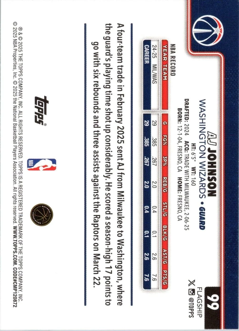 This is a nice example of a 2025-26 Topps #99 AJ Johnson