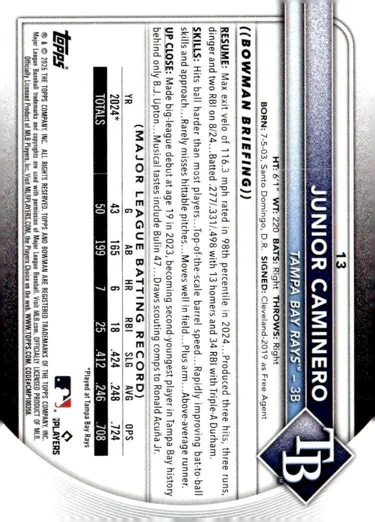This is a nice example of a 2025 Bowman #13 Junior Caminero