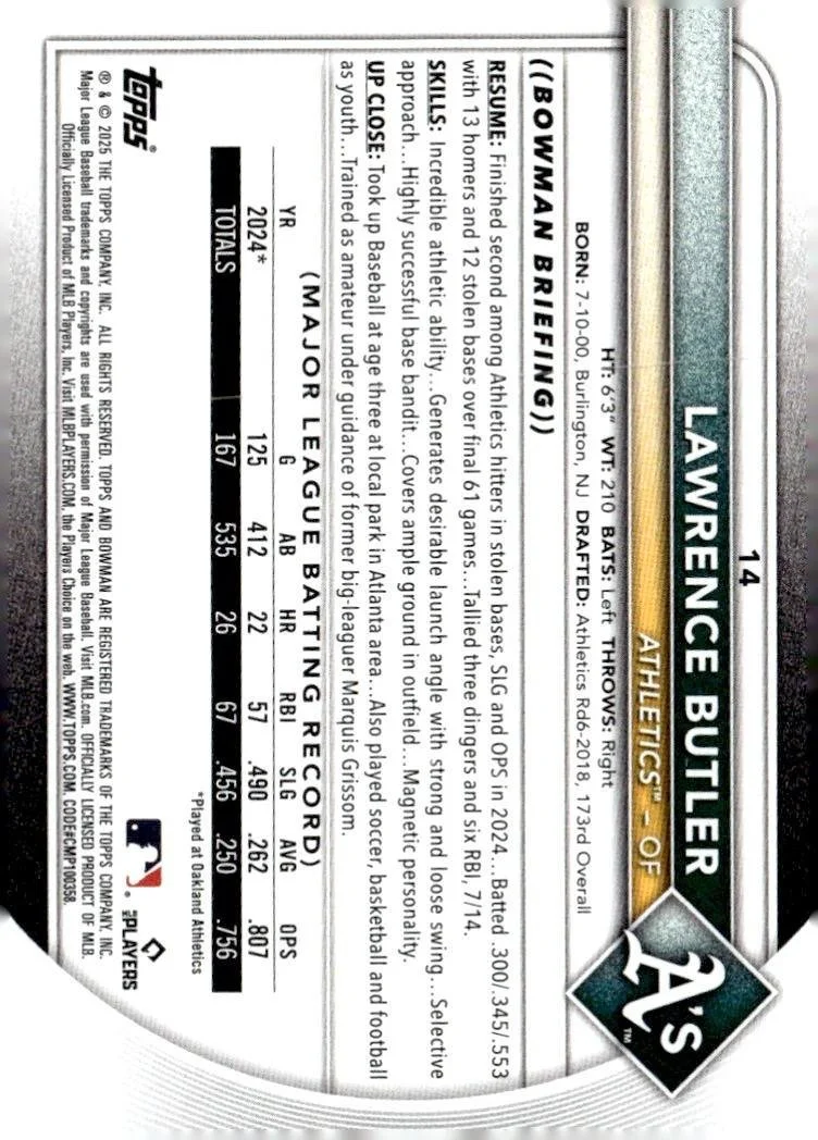This is a nice example of a 2025 Bowman #14 Lawrence Butler