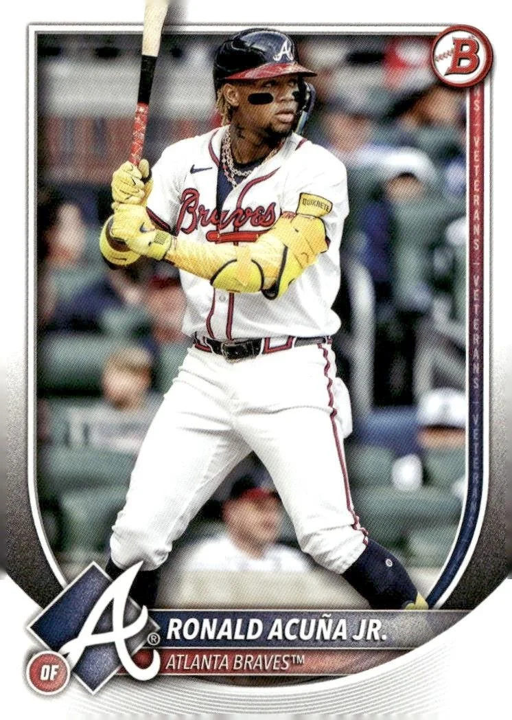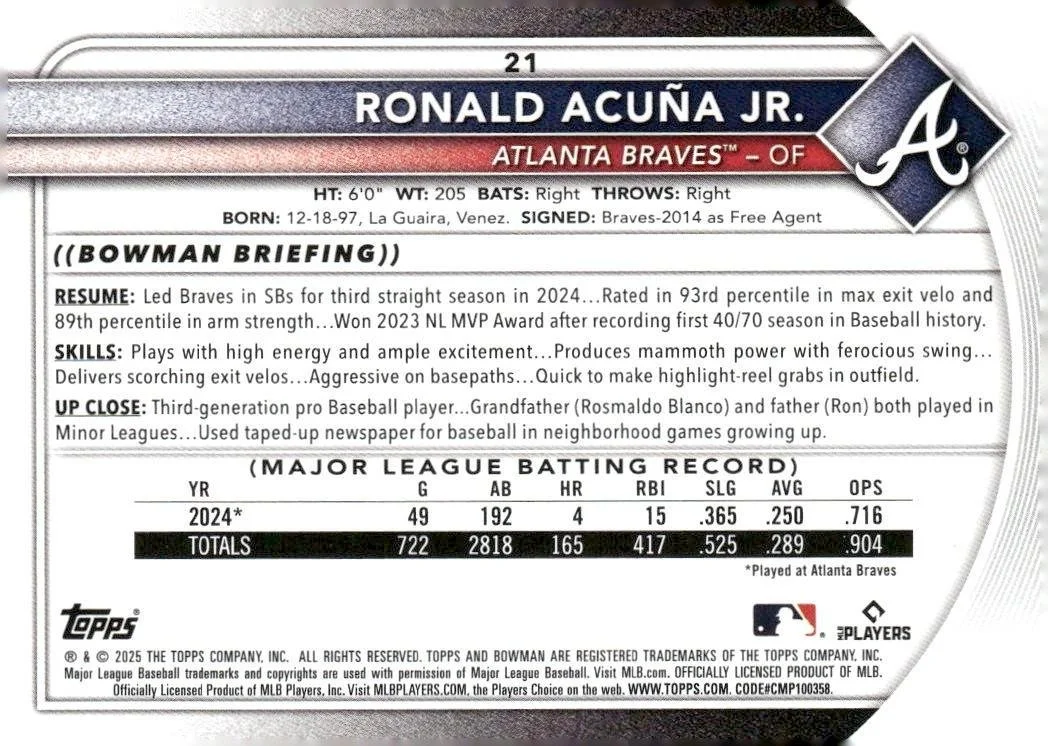 This is a nice example of a 2025 Bowman #21 Ronald Acuña Jr.