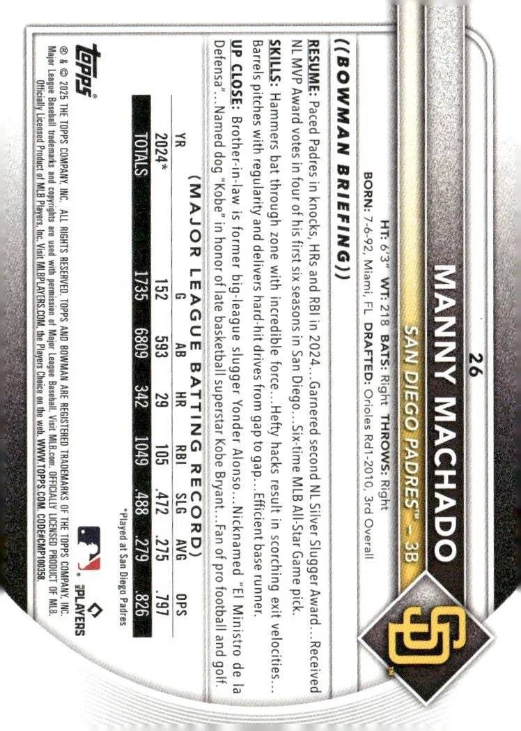 This is a nice example of a 2025 Bowman #26 Manny Machado