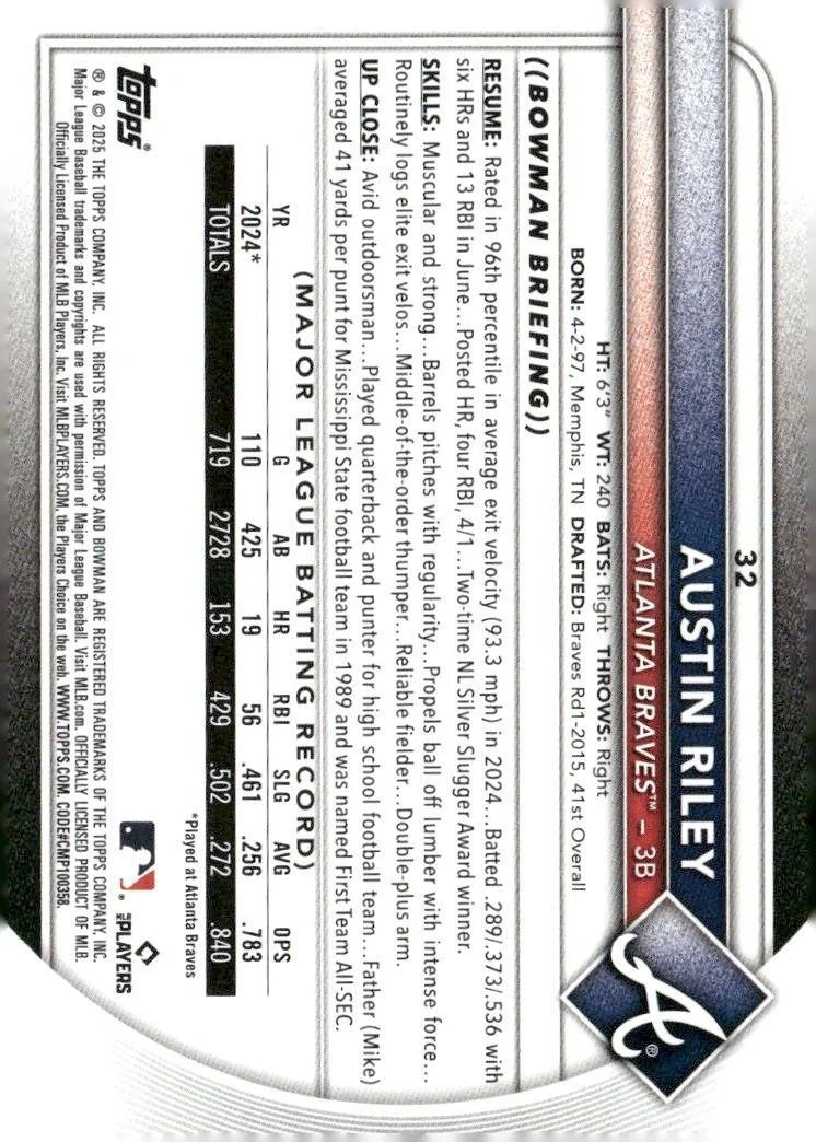 This is a nice example of a 2025 Bowman #32 Austin Riley